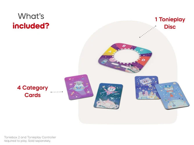 Power up for a tech-fuelled trivia adventure with The Quizzles! With 500 questions on inventions, vehicles, and gadgets, kids use their smarts to save the galaxy with this Tonieplay Game. As they journey through space with Quizzles Bert, Mae and Doo, working to restore power, before facing off against Quentin Quizzle! Tonieplay unlocks new ways to play, only on Toniebox 2. Kids just put the Tonieplay Game Disc and Tonieplay Controller on Toniebox 2 and turn, press and play their way to victory.