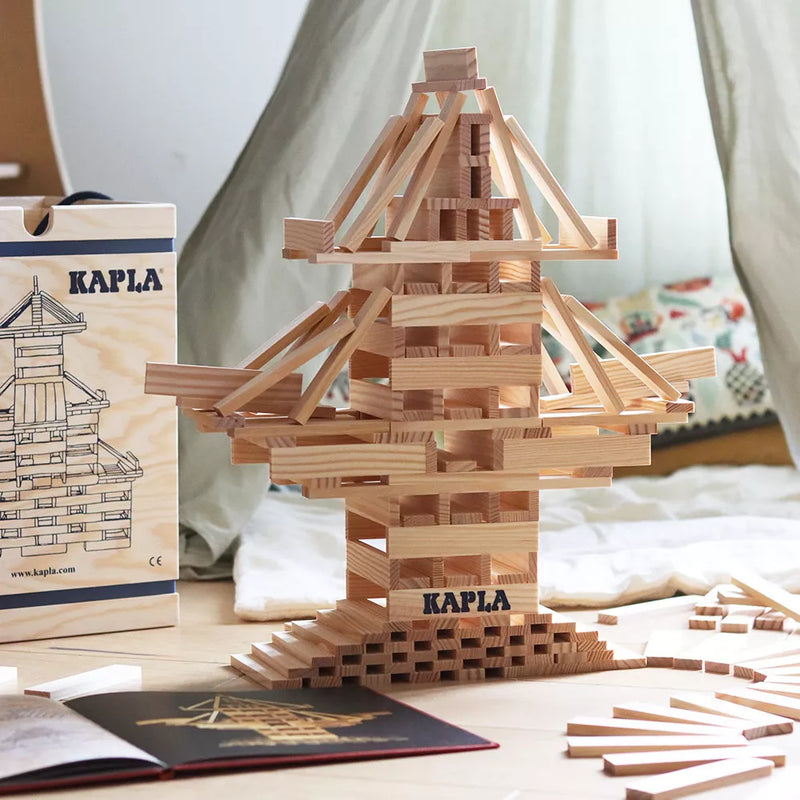 KAPLA is a wooden construction toy. The game is made up of a set of identical blocks made from pine. The unique size of the blocks, which are in the ratio of 1:3:15, makes them ideal for building many different creations.