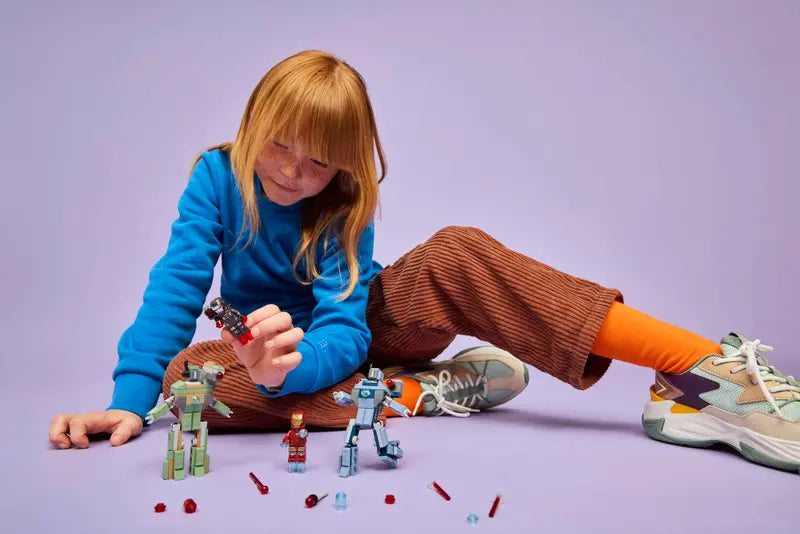 Iron Man & War Machine vs. Hammer Drones (76320) is a buildable Super Hero toy for kids who like battle action with LEGO® ǀ Marvel collectibles. With fun features and cool weapons, this small gift for kids makes an ideal Super Hero present for boys and girls aged 7 years old and up. This buildable toy recreates the epic battle scene from Marvel Studios’ Iron Man 2 movie. It comes with Iron Man and War Machine minifigures and 2 buildable Hammer Drones. The Hammer Drones are fully jointed so kidscan pose the buildable figures for realistic dynamic play. The green Hammer Drone has a spring shooter on its shoulder. The blue Hammer Drone has a push shooter on each shoulder. War Machine has red hand and feet blasters and a stud shooter on hisshoulder. Iron Man has blue hand and feet blasters and can hold laser beam elements. For added digital fun, builders can zoom in, rotate models in 3D and track their progress using the intuitive LEGO Builder app. Contains 204 pieces.