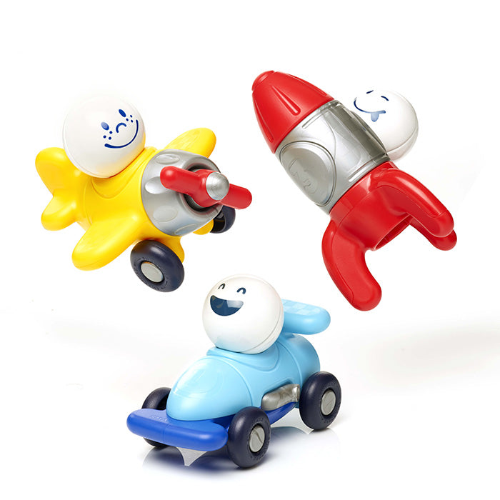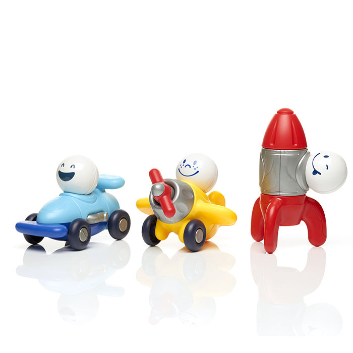 My First Explorers is a magnetic play set that seamlessly integrates into the SmartMax universe. Mix and match the car, plane, and rocket to create a unique set of vehicles and let your imagination soar. The different parts of the vehicles magnetically attach to a SmartMax bar. You can either build your vehicles around the regular bar or create an even longer version by using the long bar. My First Explorers sparks imagination, fine motor skills and encourages hand-eye coordination.